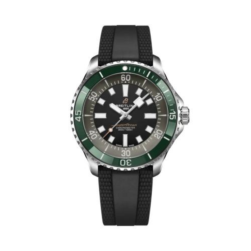 The model is fitted with a unidirectional ratcheted bezel with a green ceramic insert. The dial is black and incorporates the high-contrast layout characteristic of the Superocean line.