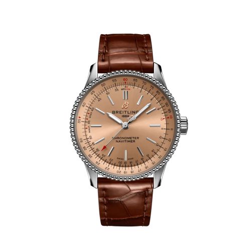 The Breitling A17395201K1P2 features a 35mm Stainless Steel case, Pink dial, 30m water resistance, Sapphire crystal.