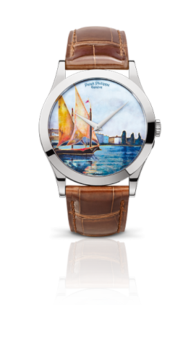 These unique pieces, inspired by paintings in the personal collection of Philippe Stern, honorary president of Patek Philippe, depict the famous traditional Lake Geneva barques.