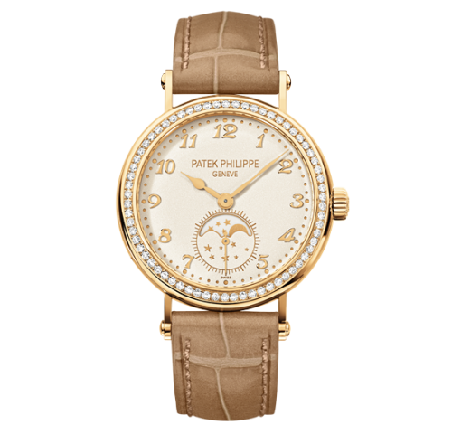 The Patek Philippe reference 7121 is a ladies watch with diamond-set bezel and a handwound movement with small seconds and moonphase complication. In its present configuration (reference 7121J-001), it features a grained, cream-colored dial with Breguet numerals and a yellow gold case.