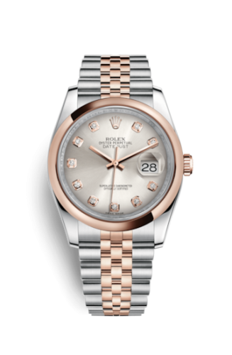 The Rolex 116201 features a 36mm Rose Gold, Stainless Steel case, Silver dial, 100m water resistance, Sapphire crystal.
