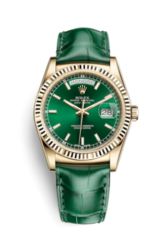 The Rolex 118138 features a 36mm Yellow Gold case, Green dial, 100m water resistance, Sapphire crystal.