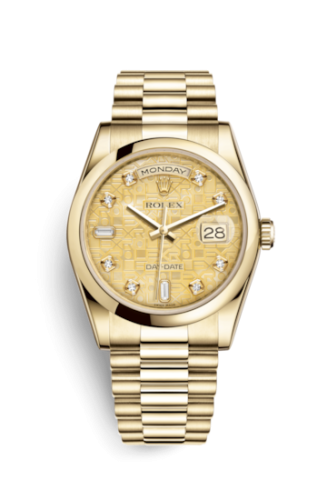The Rolex 118208 features a 36mm Yellow Gold case, Champagne dial, 100m water resistance, Sapphire crystal.