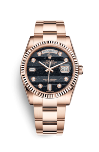 The Rolex 118235f features a 36mm Rose Gold case, Black dial, 100m water resistance, Sapphire crystal.