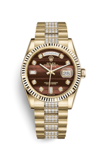 The Rolex 118238 features a 36mm Yellow Gold case, Brown dial, 100m water resistance, Sapphire crystal.