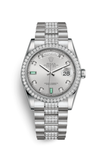 The Rolex 118346 features a 36mm Platinum case, Silver dial, 100m water resistance, Sapphire crystal.