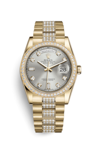 The Rolex 118348 features a 36mm Yellow Gold case, Silver dial, 100m water resistance, Sapphire crystal.