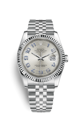 The Rolex 116234 features a 36mm White Gold, Stainless Steel case, Silver dial, 100m water resistance, Sapphire crystal.