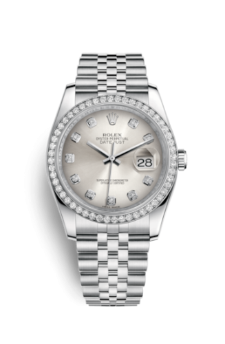 The Rolex 116244 features a 36mm White Gold, Stainless Steel case, Silver dial, 100m water resistance, Sapphire crystal.