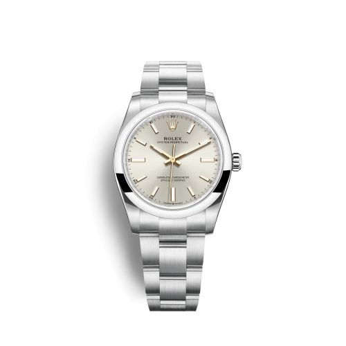 The Rolex 124200 features a 34mm Stainless Steel case, Silver dial, 100m water resistance, Sapphire crystal.